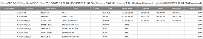 Així doncs, a ORC0-2, el guanyador en compensat va ser el Kiloton (T41R, CMPO), tot i arribar tres minuts més tard que l’Enigma (Farr 52, RCNB). L’Stam Dos (Centurion 40S, CMPO) va tancar el grup en tercera posició.