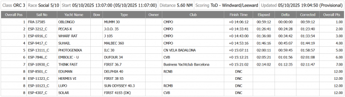A ORC3, l’Oblongo (Mumm 30, CMPO) va guanyar amb autoritat (per cinquena vegada), amb 24 minuts de marge sobre el Pekas (JOD35, CMPO), que va saber gestionar l’avantatge guanyat a la sortida i aconseguir el seu millor resultat en la lliga CMPO aquesta temporada.