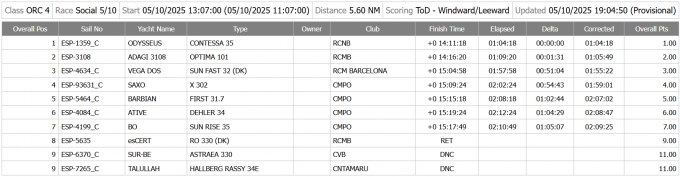 A ORC4, l’Odysseus (Contessa 35, RCNB) es va imposar a l’Adagi (Optima 101, RCMB) per poc més d’un minut, i ja suma cinc victòries aquesta temporada. El millor classificat del CMPO va ser el Saxo (X-302, CMPO), en quarta posició.