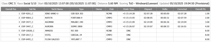 En ORC5, la cosa va estar molt ajustada, amb menys de nou minuts entre el primer i el quart (i últim) classificat. El Xino Xano (Gib Sea 302) es va imposar per 30 segons sobre el Rateta (Fortuna 9, CMPO).