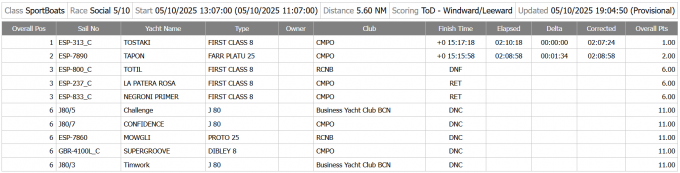 A la categoria Sportboat, la victòria va ser per al Tostaki (First Class 8, CMPO), que va aprofitar el millor rating sobre el Tapon (Farr Platu 25, CMPO).